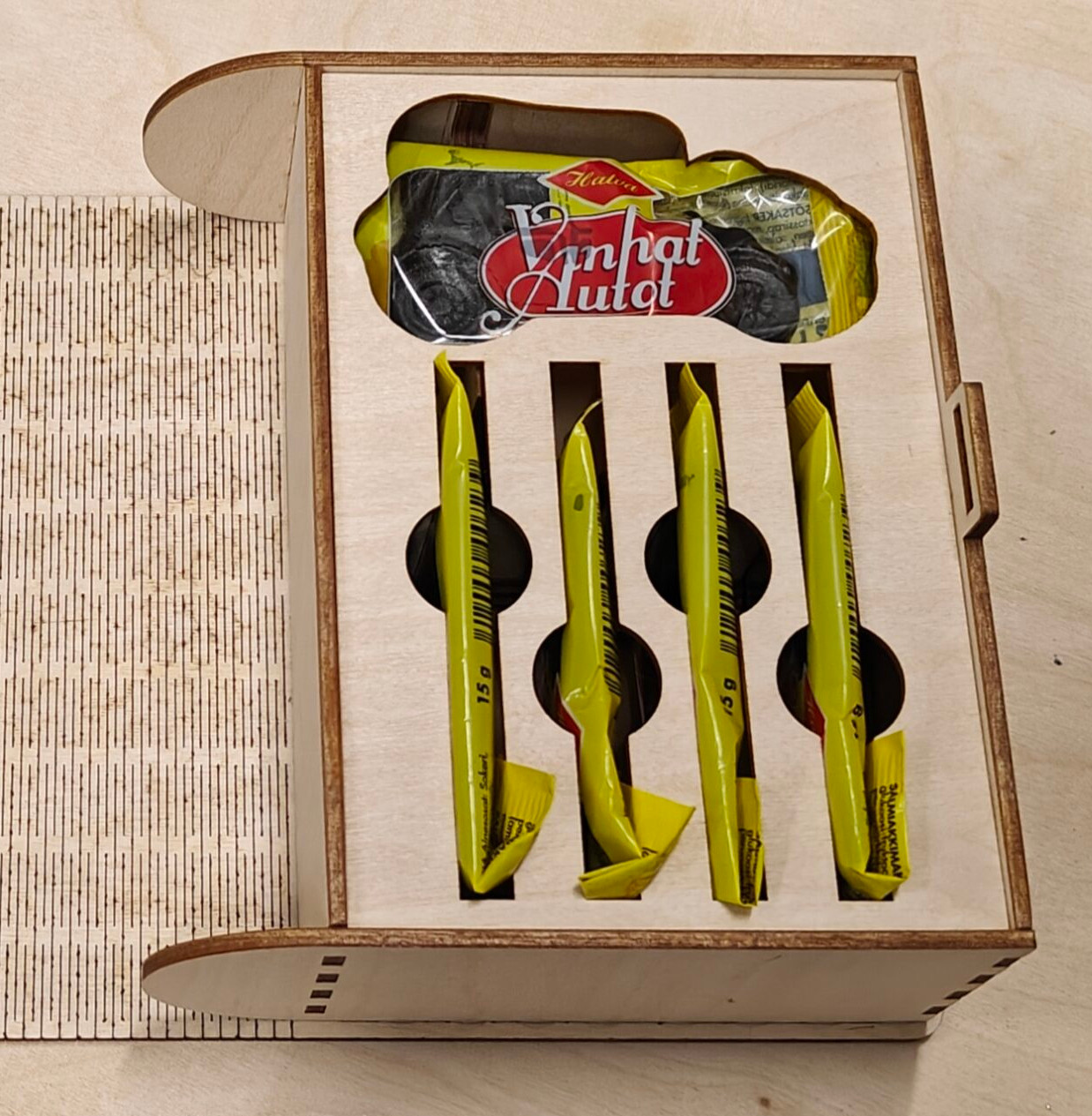 Kuvaus: Erikoispalkinto, sisällä paikat pienelle Jägermeister-pullolle ja kolmelle Vanhat autot-salmiakki-makeiselle. Kanteen asiakkaan haluama kaiverrus. Ilman sisältöä.